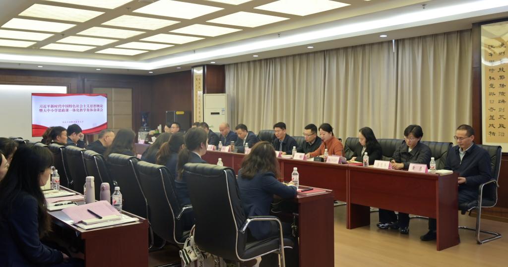 为深入学习贯彻习近平总书记关于“深入推进大中小学思想政治教育一体化建设”的重要指示精神,切实把习近平新时代中国特色社会主义思想融入思政教育全过程,2025年11月5日,习近平新时代中国特色社会主义思想概论暨大中小学思政课一体化教学集体备课会在重庆工业职业技术大学行政楼215隆重召开。学校党委书记郭天平、党委副书记周传德、副校长李雷、副校长许磊,马克思主义学院书记李慧萍、院长袁希、组织员黄勇和全体教职工以及渝北区教委、西南政法大学、重庆市渝北区两江小学、重庆市渝北区两江中学、重庆市渝北区空港实验小学、重庆市渝北区空港实验中学、重庆红岩革命历史文化中心(重庆红岩革命历史博物馆)、816小镇等单位代表齐聚一堂,共探大中小学思政育人一体化新路径,会议由副校长李雷主持。