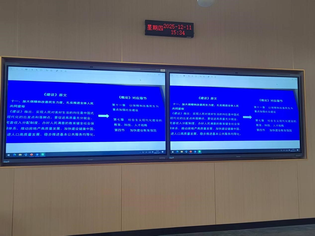 为深入学习贯彻党的二十届四中全会精神,切实把“十五五”规划蓝图转化为思政育人实效,马克思主义学院以“专题宣讲+全院深学细悟+教研室精准落地” 三级联动模式,推动全会精神从“政策话语”转化为“课堂话语”,让思政课既有理论高度又有实践温度,引导青年学子在中国式现代化建设中挺膺担当。